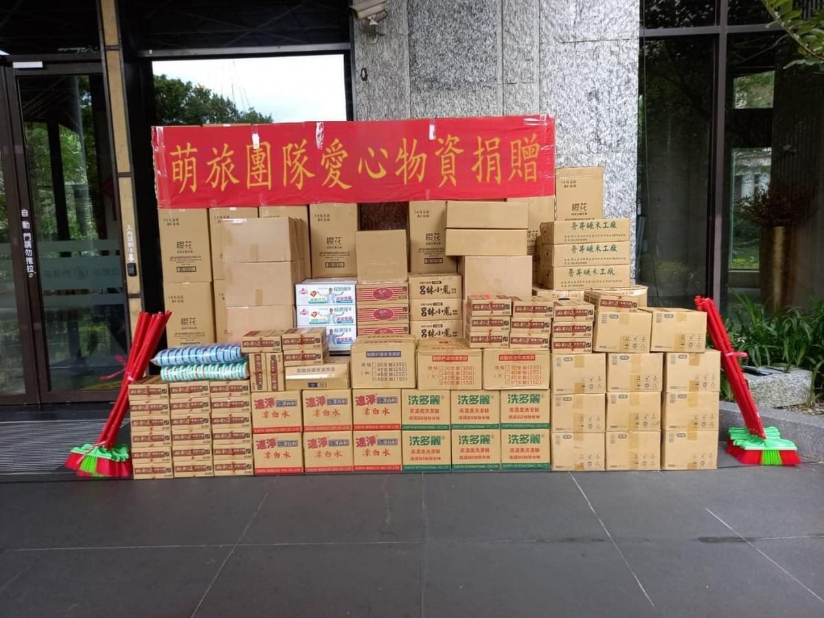 每一箱上貼著 萌旅團隊敬贈 的物資,代表的不僅是一份物資,更是一份心意